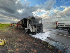 Parte da carga de soja foi perdida. De acordo com o caminhoneiro, ele carregou em Nova Alvorada – MS e estava a caminho ao Porto de Paranaguá – PR, quando parou no acostamento e percebeu que uma fumaça estava saindo do lado direito da cabine.