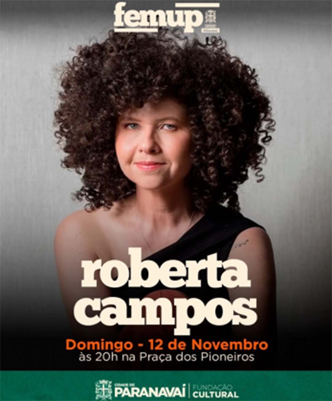A 58ª edição do Festival de Música e Poesia de Paranavaí e 55º Concurso Literário de Contos está chegando ao fim. E a Semana do Femup vai ter um encerramento pra lá de especial neste domingo (12) às 20 horas com um show gratuito da cantora e compositora Roberta Campos, reconhecida por suas canções que se tornaram trilhas sonoras de várias novelas.