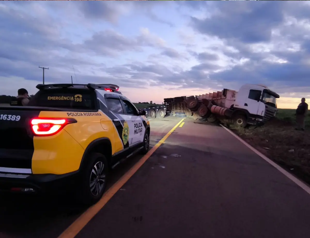 Um acidente foi registrado na tarde desta quinta-feira (3) na PR-218, no trecho entre Nova Esperança e Atalaia. De acordo com a Polícia Rodoviária Estadual (PRE), uma carreta — sendo o cavalo mecânico acoplado a dois semirreboques — trafegava pela rodovia quando o motorista perdeu o controle da direção, provocando o tombamento dos dois últimos compartimentos.