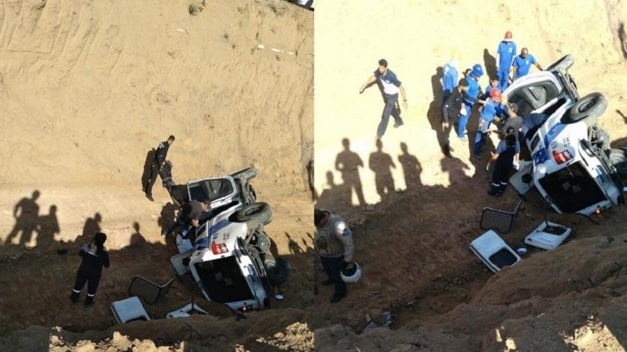 SÃO PAULO, SP (UOL/FOLHAPRESS) – Um carro da Polícia Militar do Espírito Santo despencou em um buraco de cerca de oito metros de altura, na manhã desta quarta-feira (8), em um acidente que deixou um soldado morto, na cidade de Serra (ES). No veículo estavam ainda outros dois PMs que foram resgatados com ferimentos e um cão farejador, que passa bem.