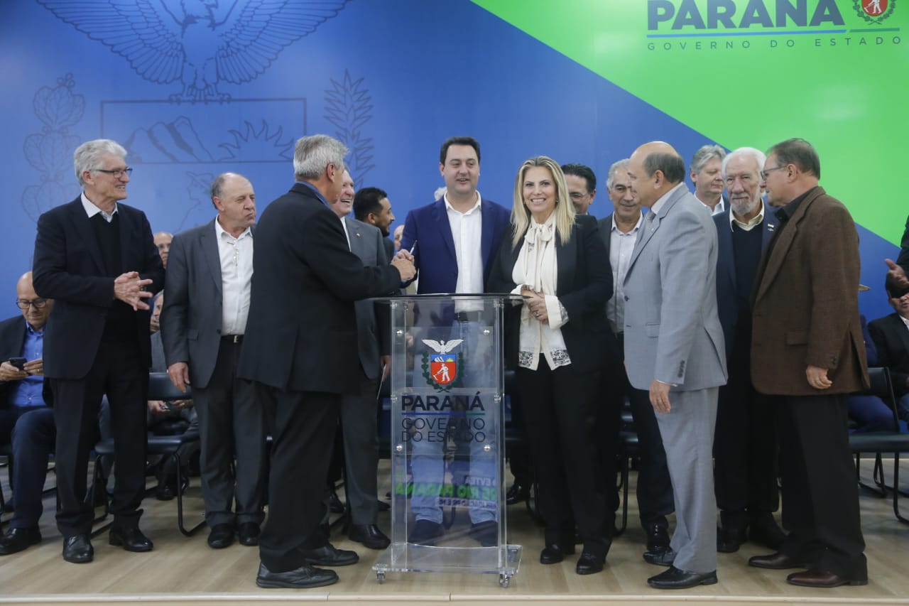 Cida participou nesta segunda-feira (30) no Palácio Iguaçu da assinatura de um convênio entre os governadores Carlos Massa Ratinho Junior e Reinaldo Azambuja, do Mato Grosso do Sul e o diretor-geral da Itaipu, almirante Anatalício Risden. A Itaipu investirá R$ 3,2 milhões no Estudo.
