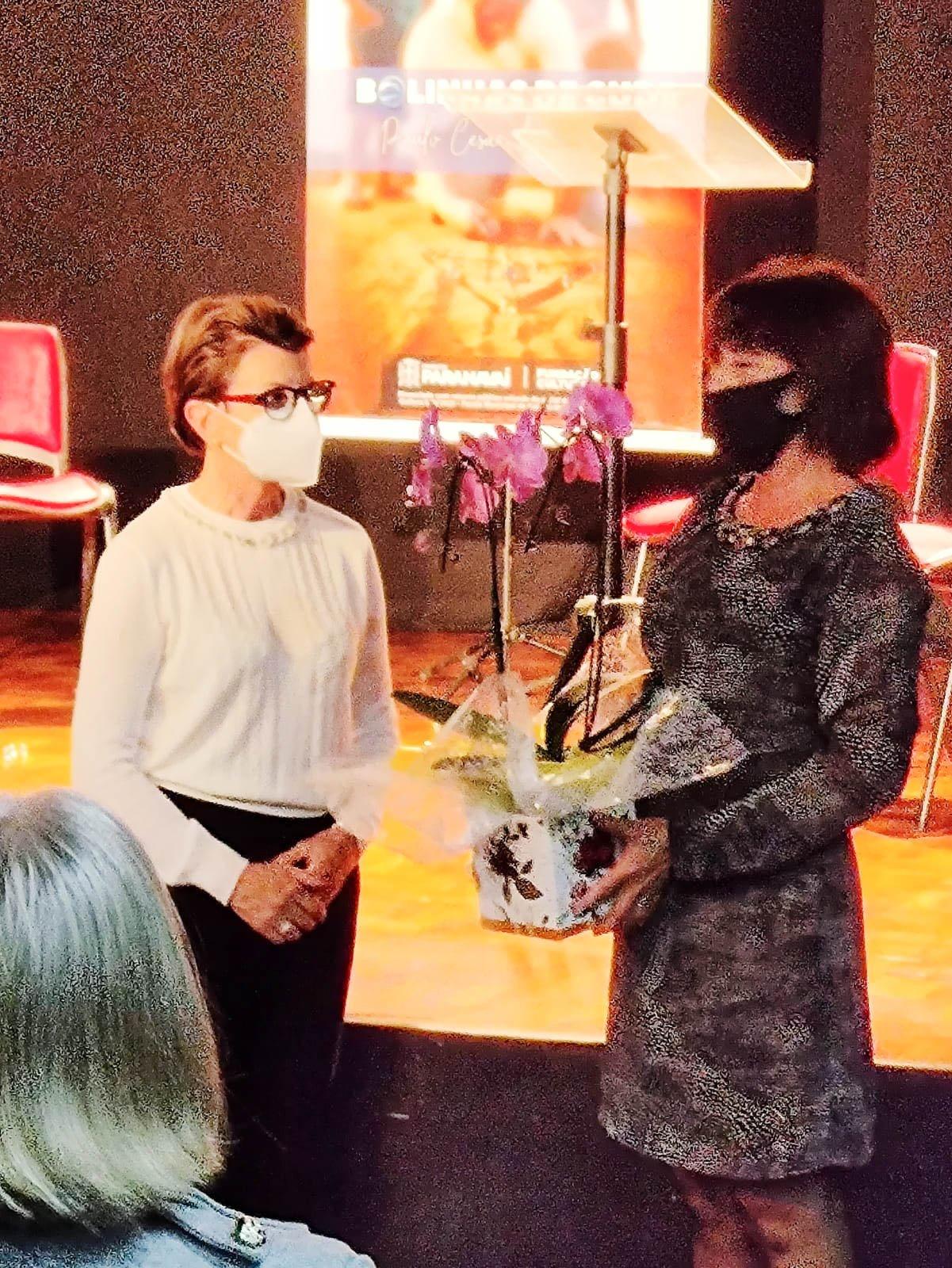 Nas fotos, Ariane, uma das filhas de PC, ao lado de Martinelli, autor do projeto; e a ex-primeira-dama do município, Cristina Lorenzetti, homenageando Ariel, esposa do compositor, escritor e ator. PC foi presidente da Fundação Cultural durante a gestão de Rogério Lorenzetti.