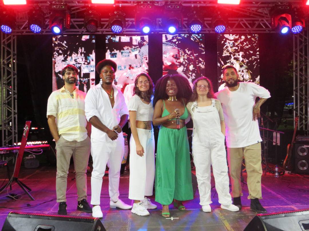 Abrindo as apresentações da semana do 58º Festival de Música e Poesia de Paranavaí (FEMUP), Rubia Divino realizou o show “Transborda”, explorando em sua música elementos do jazz, afrobeat, samba e maracatu. Na foto, a cantora e sua equipe.
