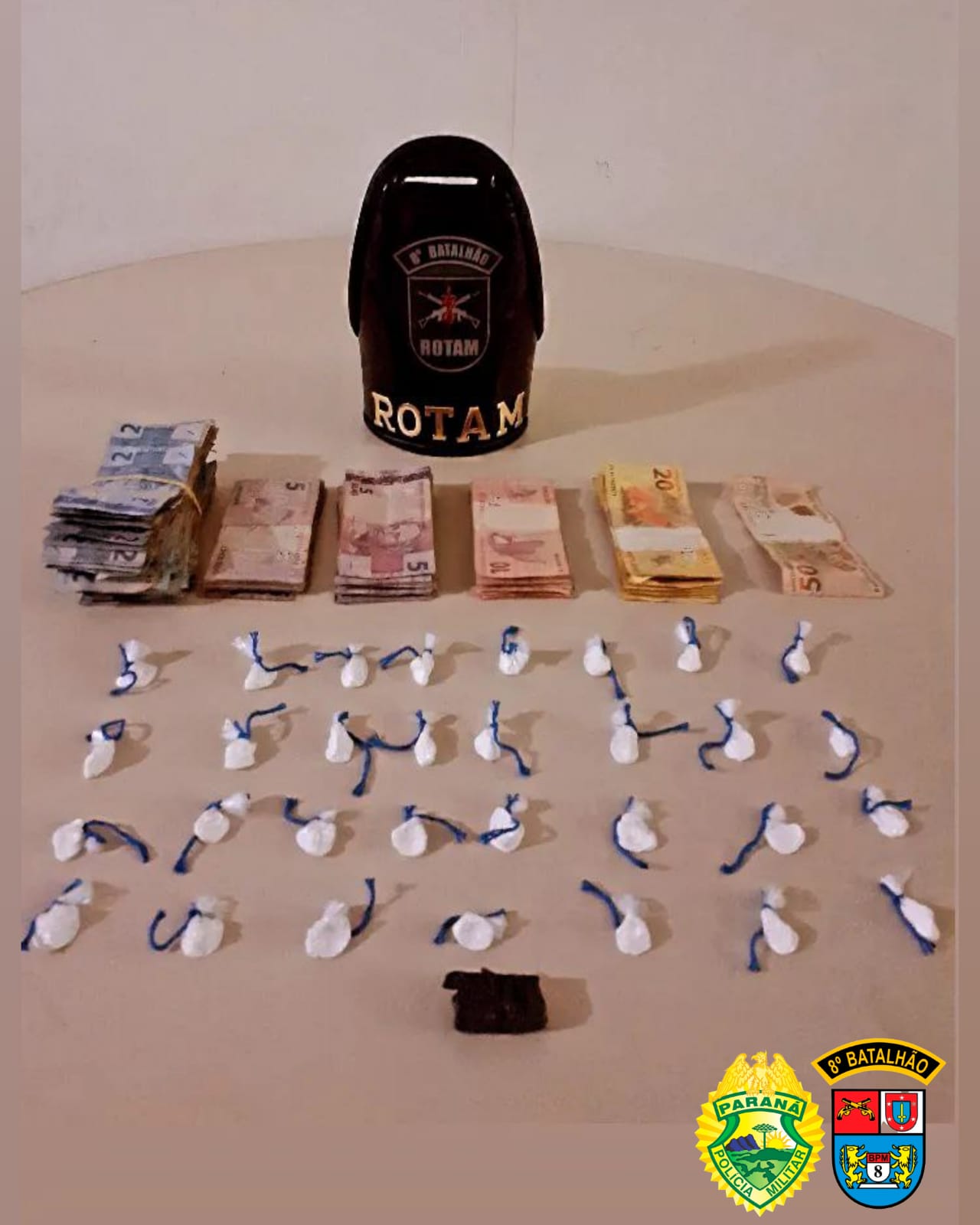 Juntamente com droga e dinheiro apreendidos, o suspeito foi encaminhado para a Delegacia de Polícia Civil de Paranavaí.