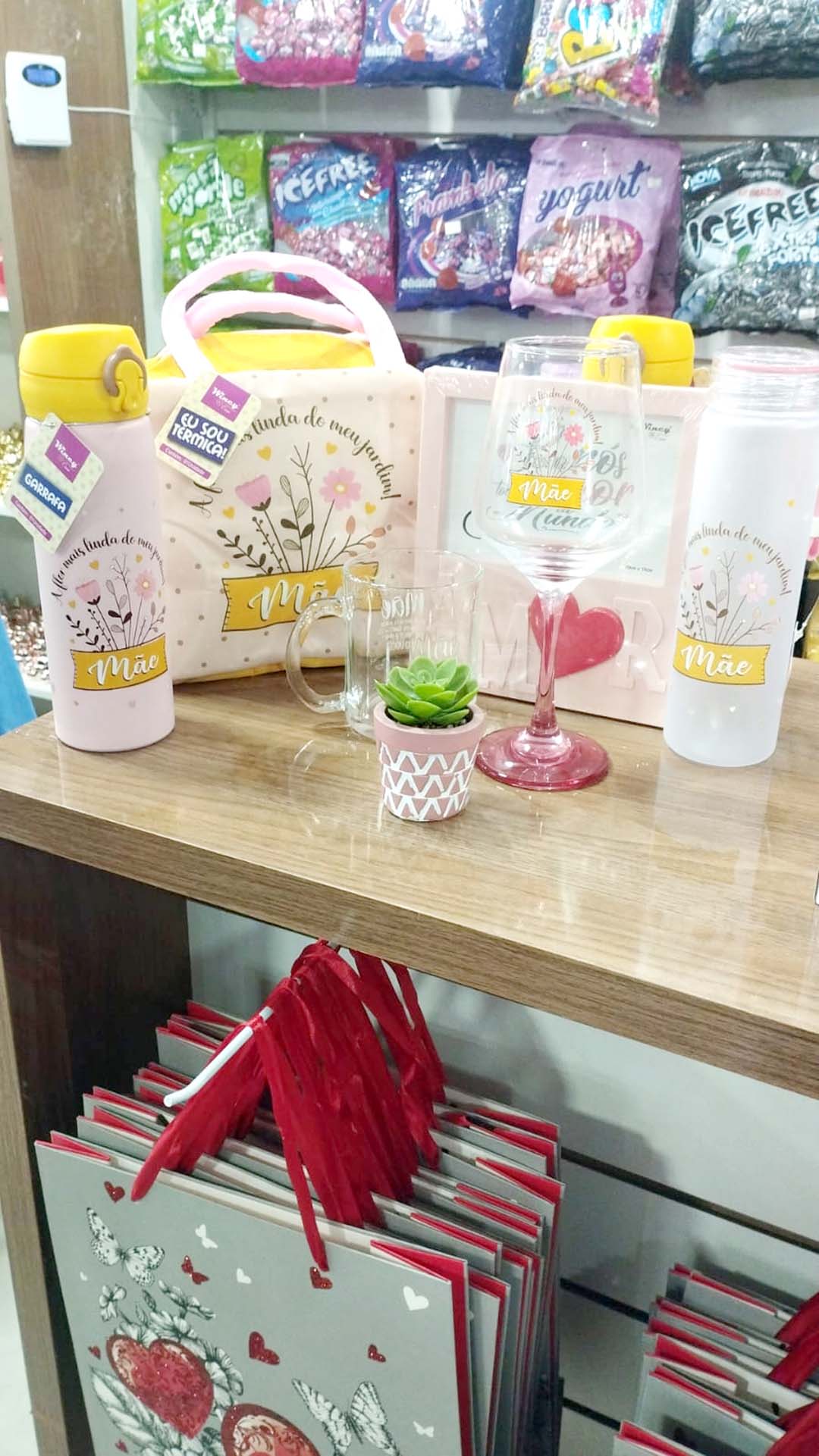 - A loja também possui taças personalizadas para as mães que não dispensam um bom vinho.