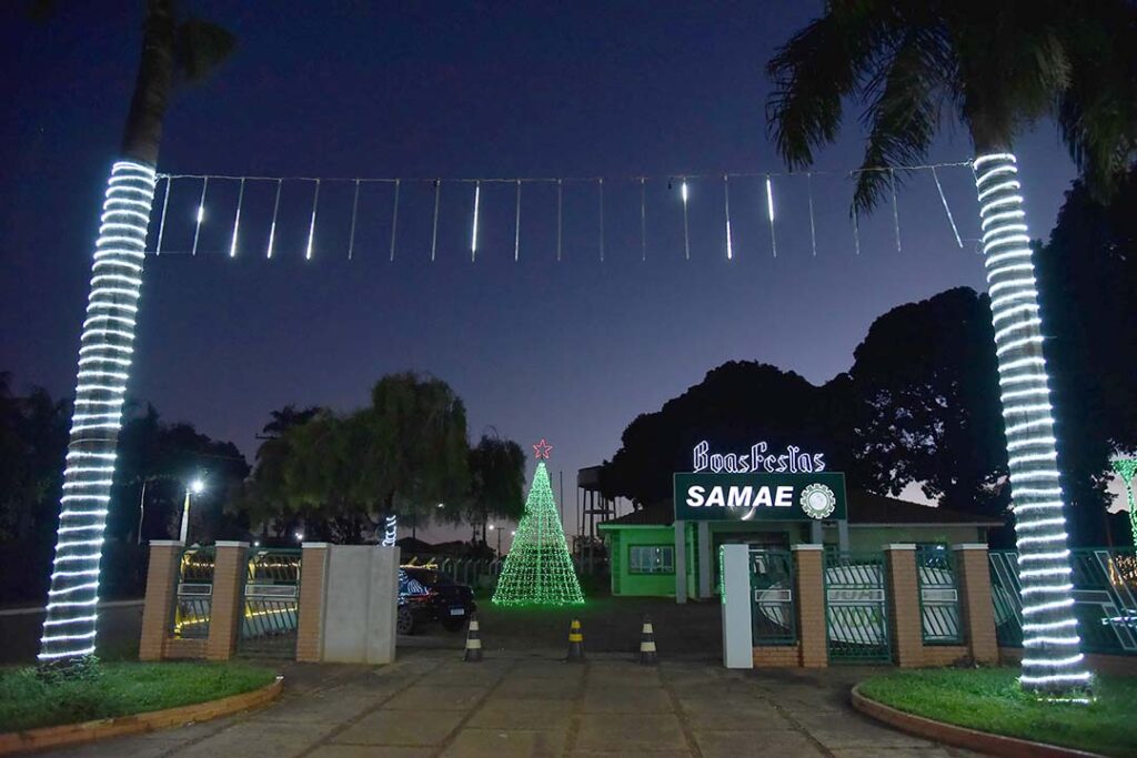 As palavras que traduzem o carinho pela cidade foram iluminadas pelo brilho do Natal: a fachada do Samae recebeu decoração especial e muitas luzes – em forma de cascata, contornando a árvore de Natal, no desejo de boas festas.