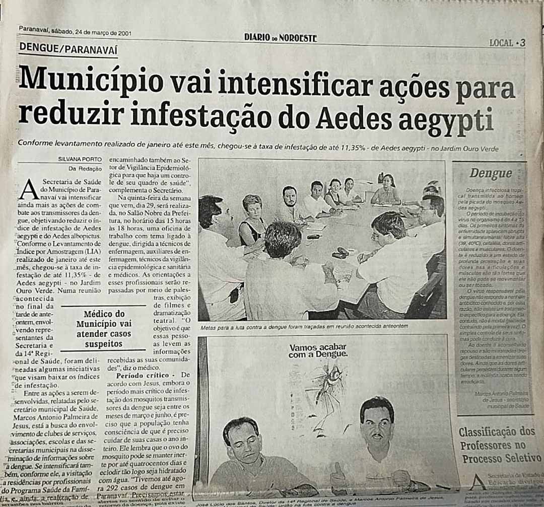 No dia 24 de março de 2001, a capa do Diário do Noroeste estampou a manchete: Município vai intensificar ações para reduzir infestação do Aedes aegypti. A matéria publicada na página três foi assinada pela jornalista Silvana Porto e apresentou dados que preocupavam as autoridades de saúde à época, como o número de casos positivos de dengue em Paranavaí, 292.