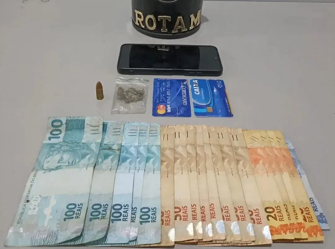 Durante a revista pessoal, uma munição 9 milímetros, uma porção de maconha, R$ 1.246,00, um aparelho celular e os cartões furtados foram localizados.