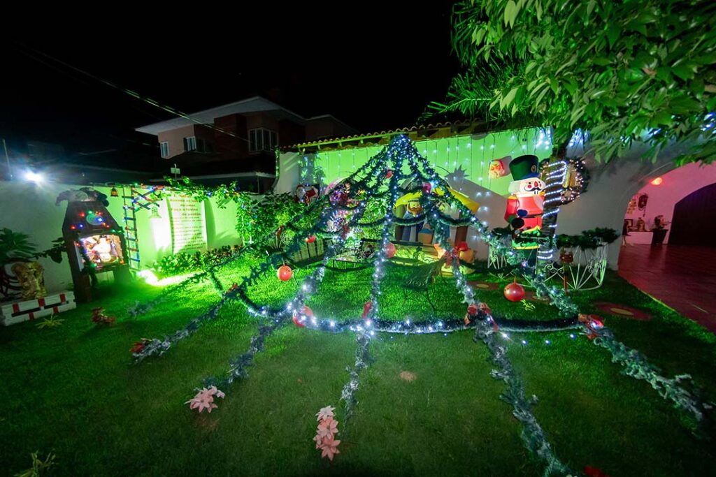A decoração que ela prepara todos os anos é famosa por reunir milhares de elementos natalinos. Tem a Sagrada Família, Papai e Mamãe Noel, bolas e árvores de Natal, guirlandas, bonecos de neve em diferentes tamanhos e formatos. São tantos itens, que ela já perdeu as contas.