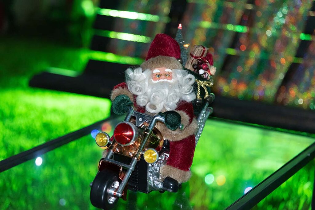 Em vez do trenó puxado pelas renas, Papai Noel viaja de motocicleta. Uma música animada acompanha o Bom Velhinho, que se mexe graciosamente sobre o veículo. A versão inusitada do personagem natalino é o xodó de Evanir Lourdes Fernandes, a dona Iva, moradora de Paranavaí.