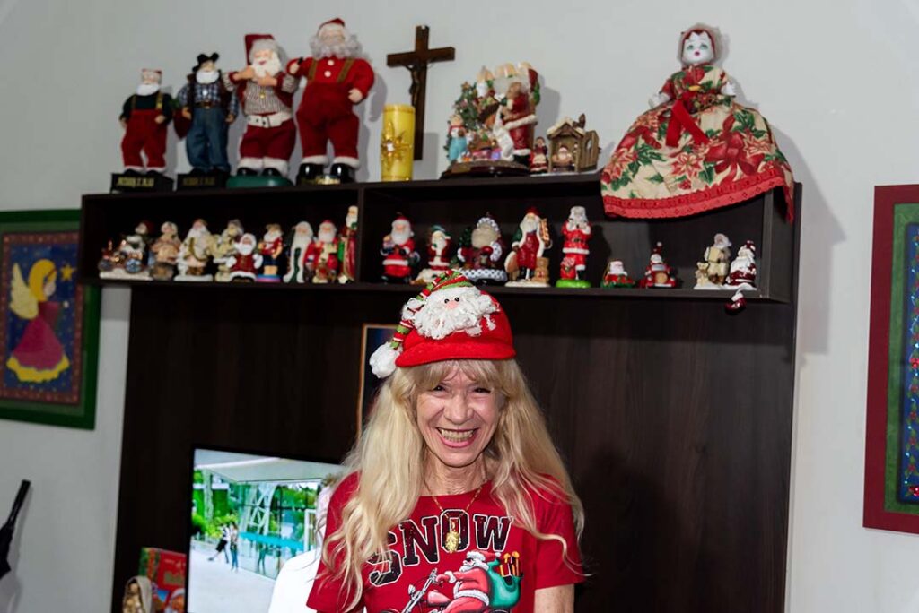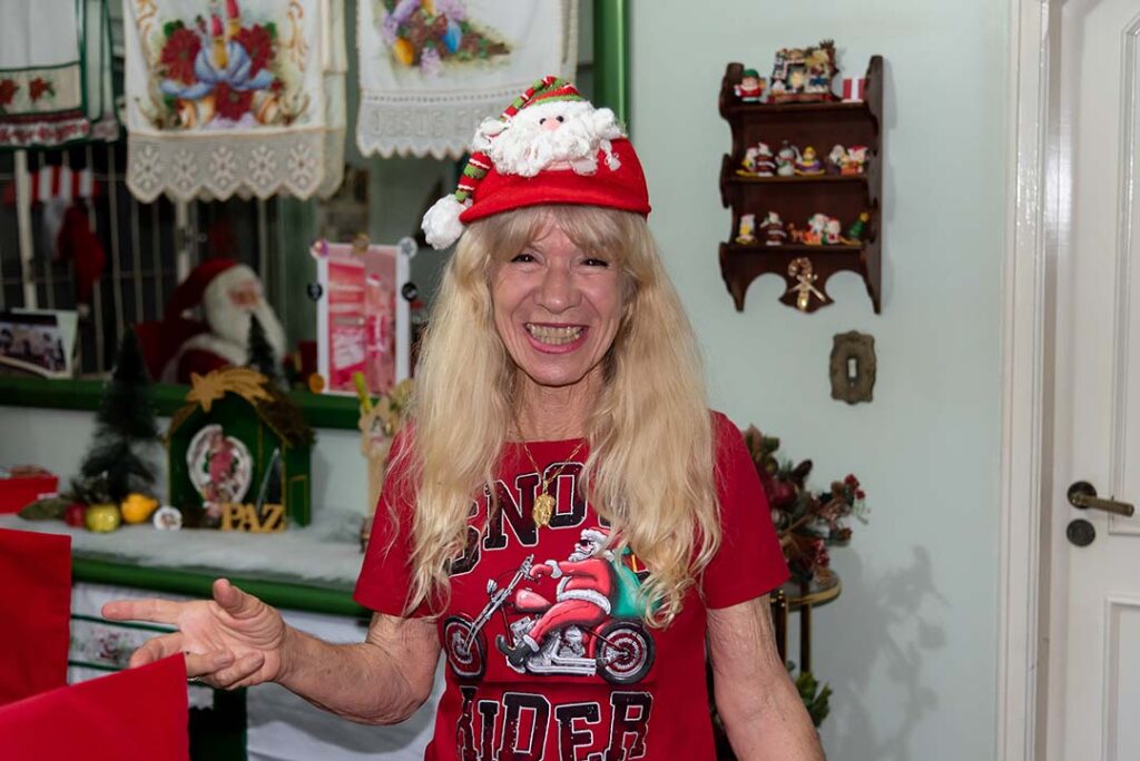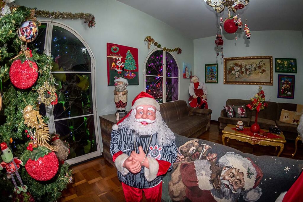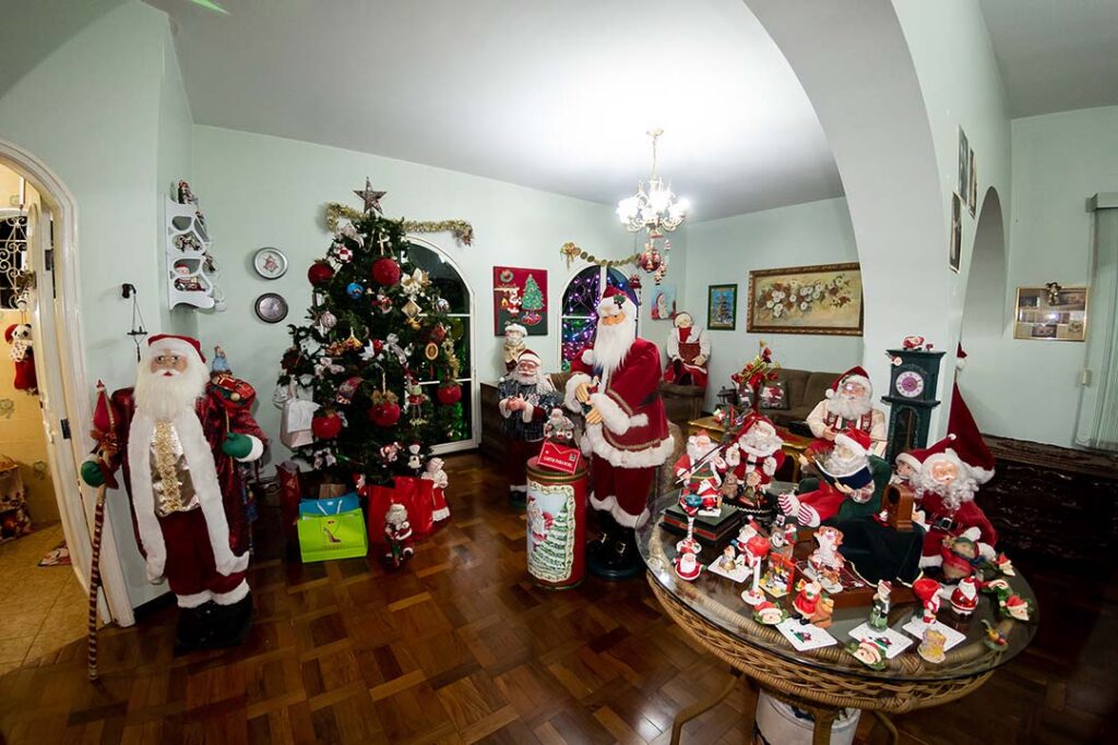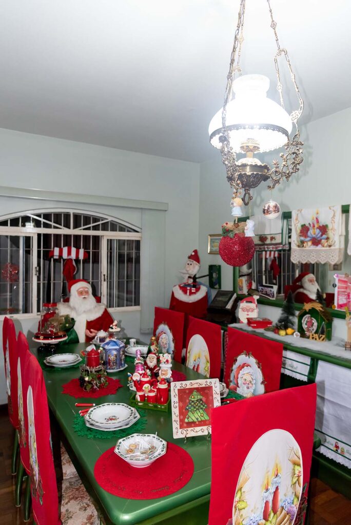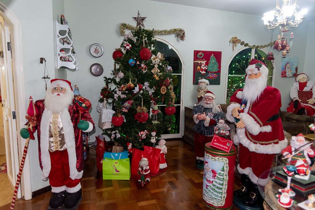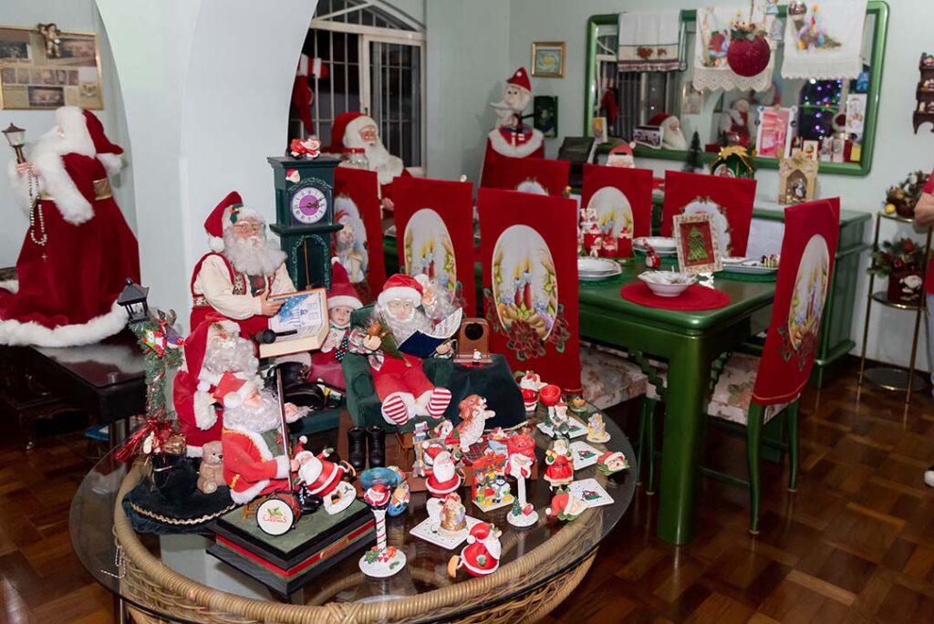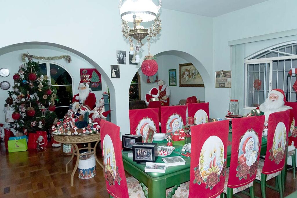 Ela nos conduz para a sala. A imagem é surpreendente. São tantos papais noéis, que os olhares se perdem admirados. Eles estão por todos os lados, sobre a mesa, no canto do cômodo, lado a lado nas prateleiras. Miniaturas, pequenos, médios grandes. “Aquela Vovó Noel é catarinense”, aponta para a boneca de mais de um metro de altura. “Meu genro trouxe de presente. Veio no carro com ele.”