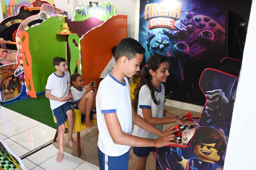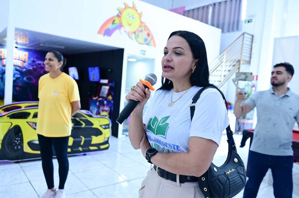 Lá também estava a professora Paula Patrícia Figueiredo. Apaixonada pela educação, ela participou com entusiasmo das ações. Chegou até a brincar em uma das atrações do Buffet Tayna (com toda razão, é muito legal – também fui).