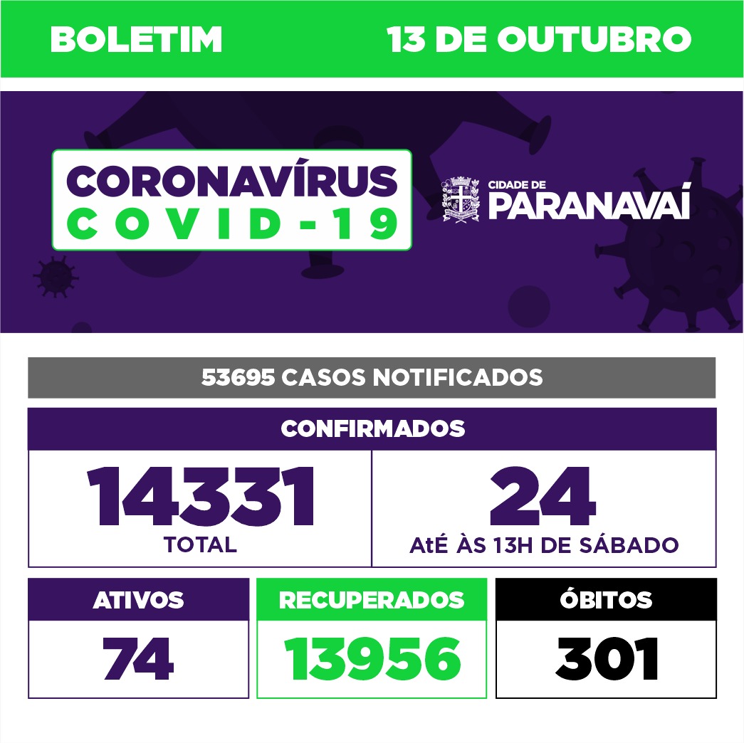 Com os novos resultados de exames, subiu para 14.331 o número de confirmações de Covid-19 em Paranavaí. Desse total, 13.956 pessoas já passaram dos 14 dias de início dos sintomas e estão fora do período de transmissão da doença. Outras 74 ainda estão com o vírus ativo, sendo monitoradas pela Secretaria de Saúde.