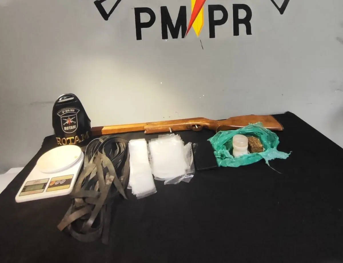 No interior da casa, os policiais localizaram mais 86,7 gramas de maconha, um simulacro de arma de fogo, uma balança de precisão e embalagens para o fracionamento das drogas.