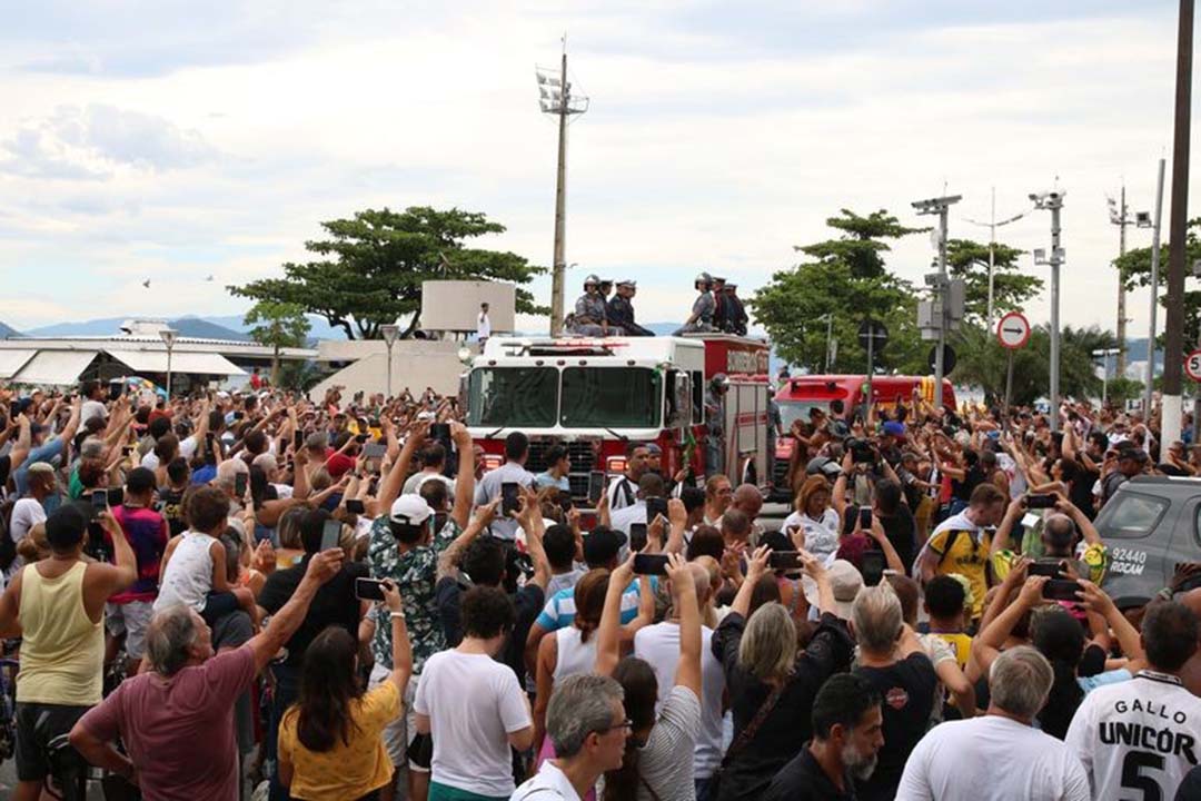 Um abraço da cidade – Após o velório, houve um cortejo com o corpo de Pelé pelos bairros de Santos no carro do Corpo de Bombeiros. A saudação durou quatro horas e percorreu cerca de 14 quilômetros.
