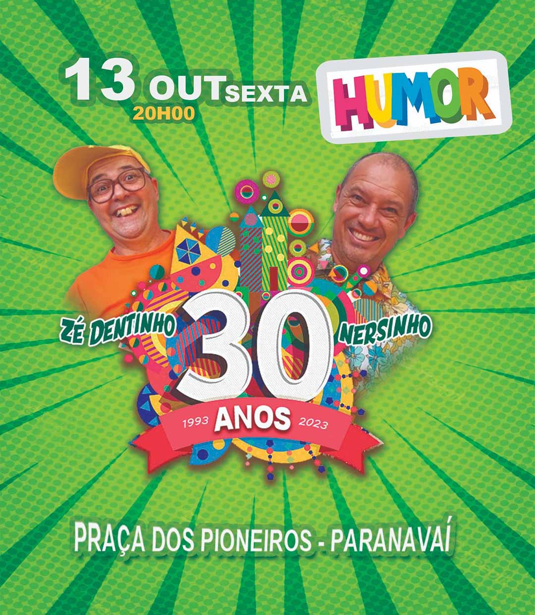 Com muito bom humor e promovendo ótimas risadas, os humoristas Zé Dentinho e Nersinho se apresentarão no dia 13 de outubro, uma sexta-feira, às 20h, na Praça dos Pioneiros de Paranavaí. O show será gratuito e contará com a presença de um palco.