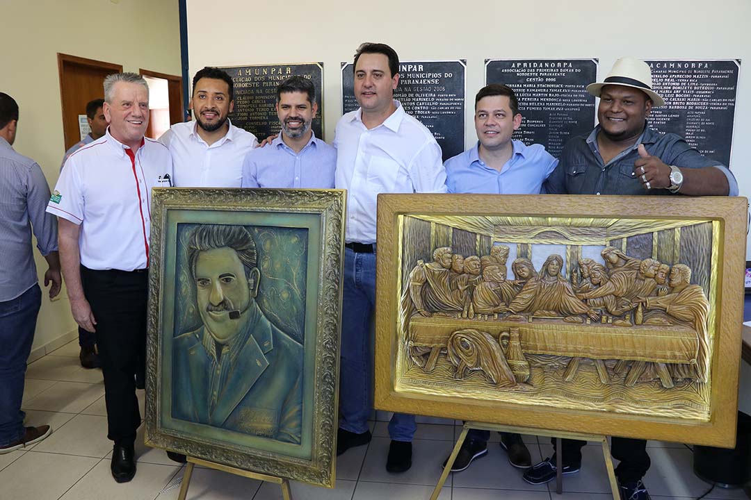 Durante a visita que fez a Paranavaí nesta quarta-feira, 20, o governador Carlos Massa Ratinho Júnior recebeu um presente do artesão Rogério Siqueira. Trata-se de um retrato do apresentador Ratinho, do SBT (pai do governador), entalhado em madeira com acabamento em pintura. Siqueira disse que foi uma forma de expressar a admiração que tem pelo comunicador. Quem deseja contratar o talento do artista paranavaiense para futuras obras pode fazer contato através do telefone 99826-0338.