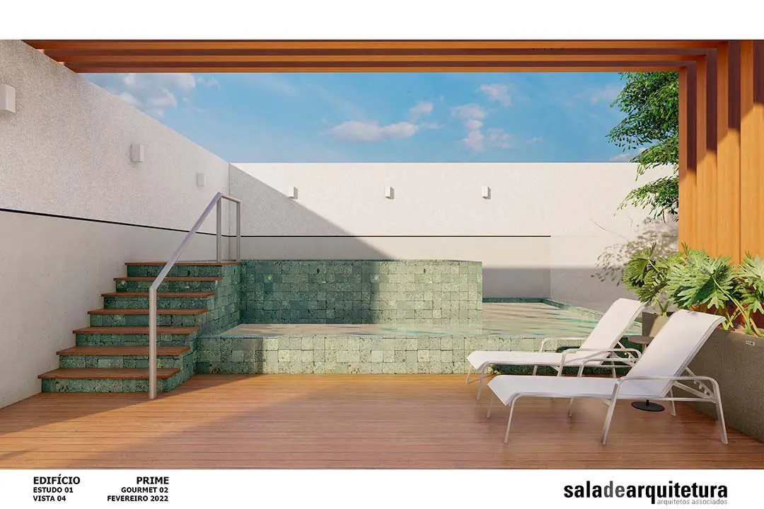 Segundo André Mázzia, engenheiro responsável pelo empreendimento, o local foi desenvolvido como um diferencial, porque as piscinas sociais do prédio são destinadas somente aos moradores. “Em caso de eventos promovidos na área social, os convidados ficam vedados a utilizar as piscinas principais. Quando a gente concebe um empreendimento com uma piscina privativa integrada, essa área de lazer é do espaço da churrasqueira gourmet. Se você chamar os amigos para um evento, essa piscina poderá ser utilizada pelos visitantes”, detalha Mázzia.