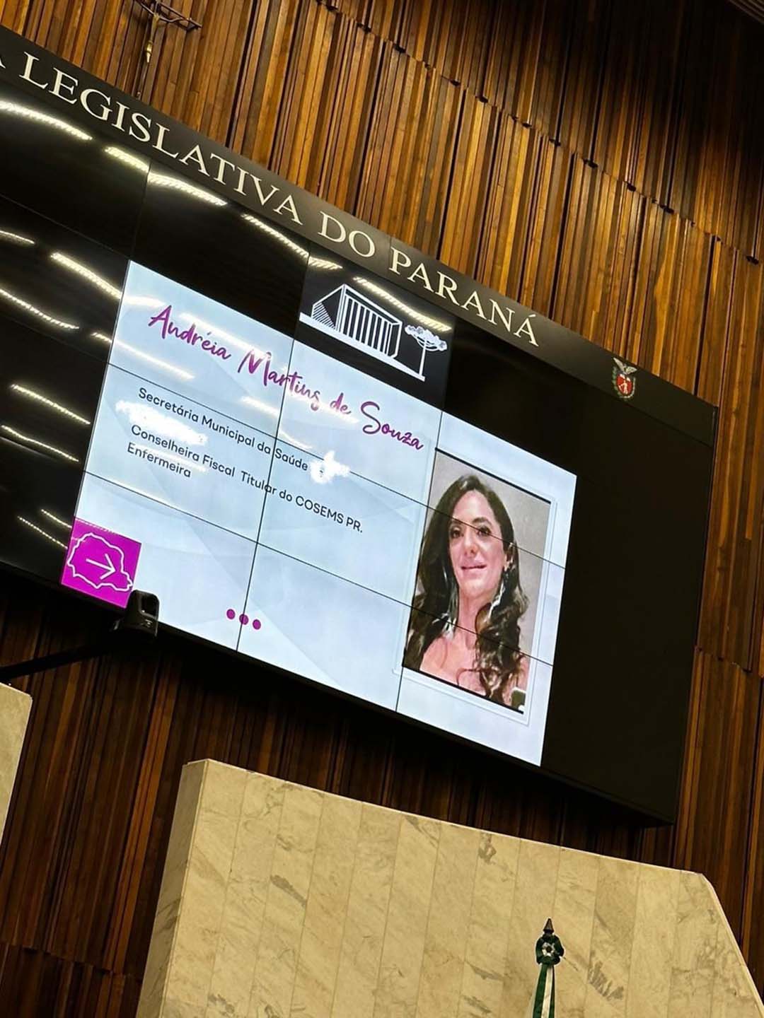 A secretária de Saúde de Paranavaí, Andreia Vilar, foi homenageada durante sessão da Assembleia Legislativa do Paraná (Alep) na segunda-feira (29). Ela recebeu diploma de Menção Honrosa e o troféu “A Força da Vida”.