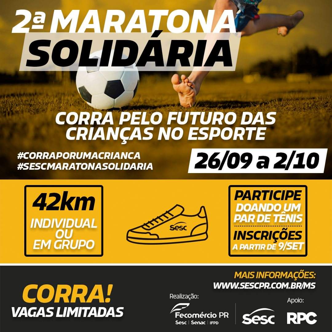 O Sesc-PR está com inscrições abertas para a II Maratona Solidária. Serão 42 quilômetros de percurso individual, em duplas, quartetos ou até octetos. Em vez da cobrança em dinheiro, o pagamento da taxa de inscrição se dará através da doação de pares de tênis, e em Paranavaí serão destinados às 80 crianças da Escola Municipal Santos Dumont atendidas pelo projeto esportivo Aprender e Jogar.