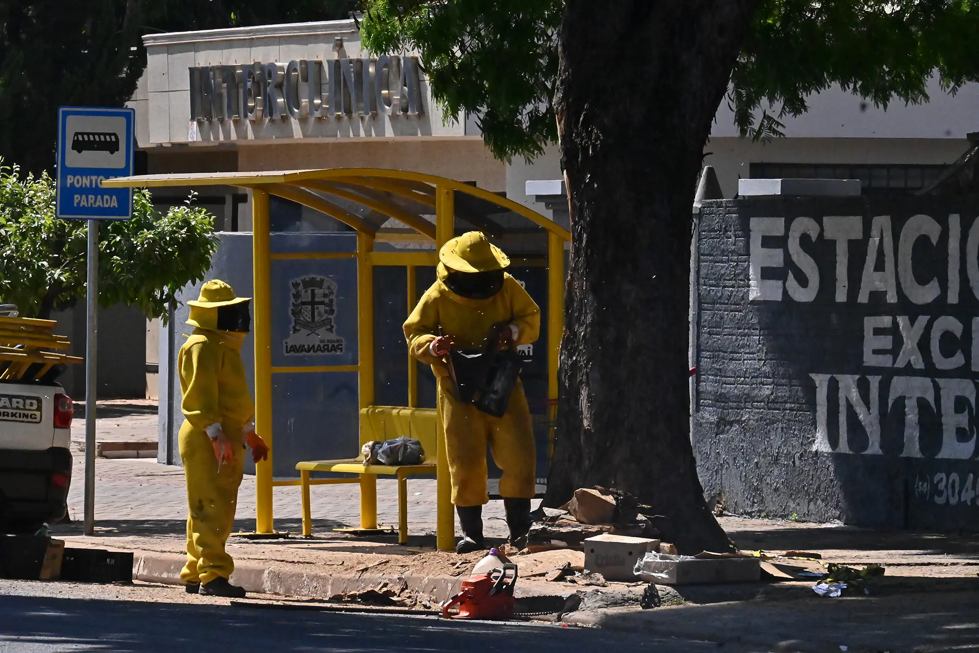 Um trecho da Avenida Rio Grande do Norte, no Centro de Paranavaí, está interditado na manhã desta sexta-feira (5). Equipes da Secretaria de Meio Ambiente trabalham no local para retirar um enxame de abelhas que se instalou em uma árvore e, por isso, o trânsito de veículos e pedestres foi proibido.